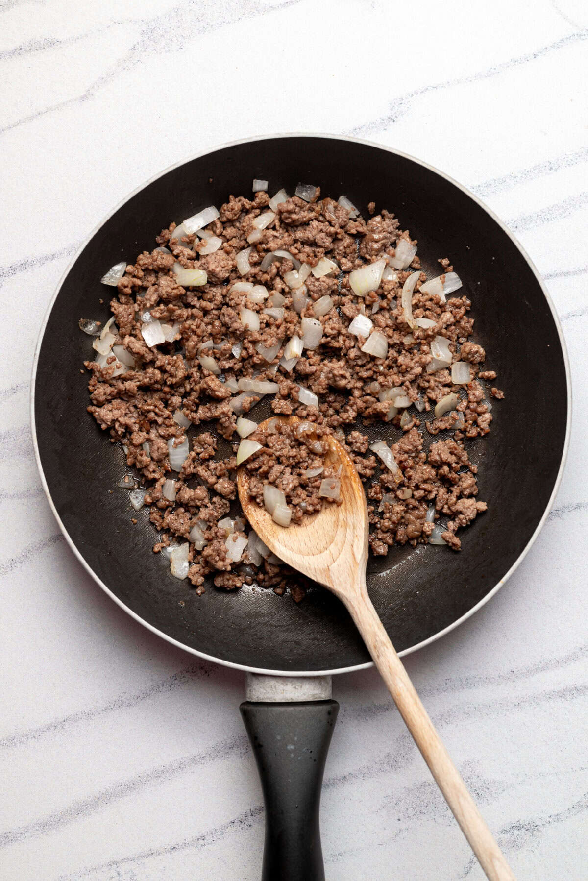 Heat olive oil in a skillet over medium-high heat. Add the diced onion and lean ground beef. Season with salt and black pepper. Cook until the beef is browned and the onion is soft, about 5-7 minutes. Drain any excess fat.