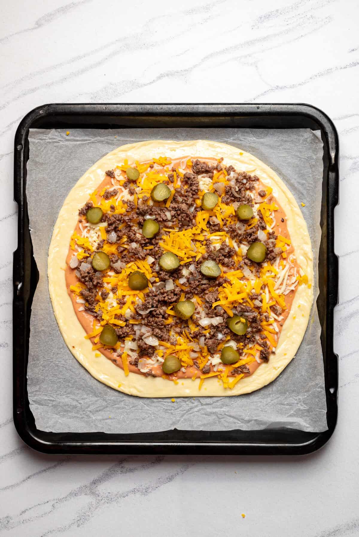 Spread the sauce evenly over the rolled-out dough. Sprinkle a thin layer of mozzarella cheese, then add the cooked beef-onion mixture. Top with shredded cheddar cheese and arrange dill pickle slices evenly across the pizza.