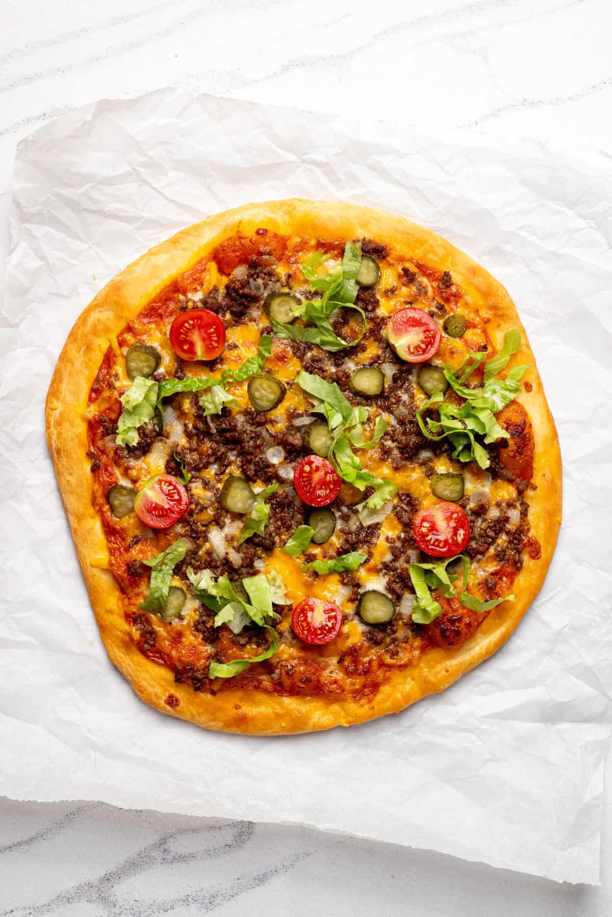 When my kids were young, we used to go to a pizza buffet restaurant for lunch. The array of different toppings was mind-boggling. But I remember one of my favorites was cheeseburger pizza—complete with pickles, lettuce, and tomatoes. Oddly enough, I’ve never made this at home until recently.