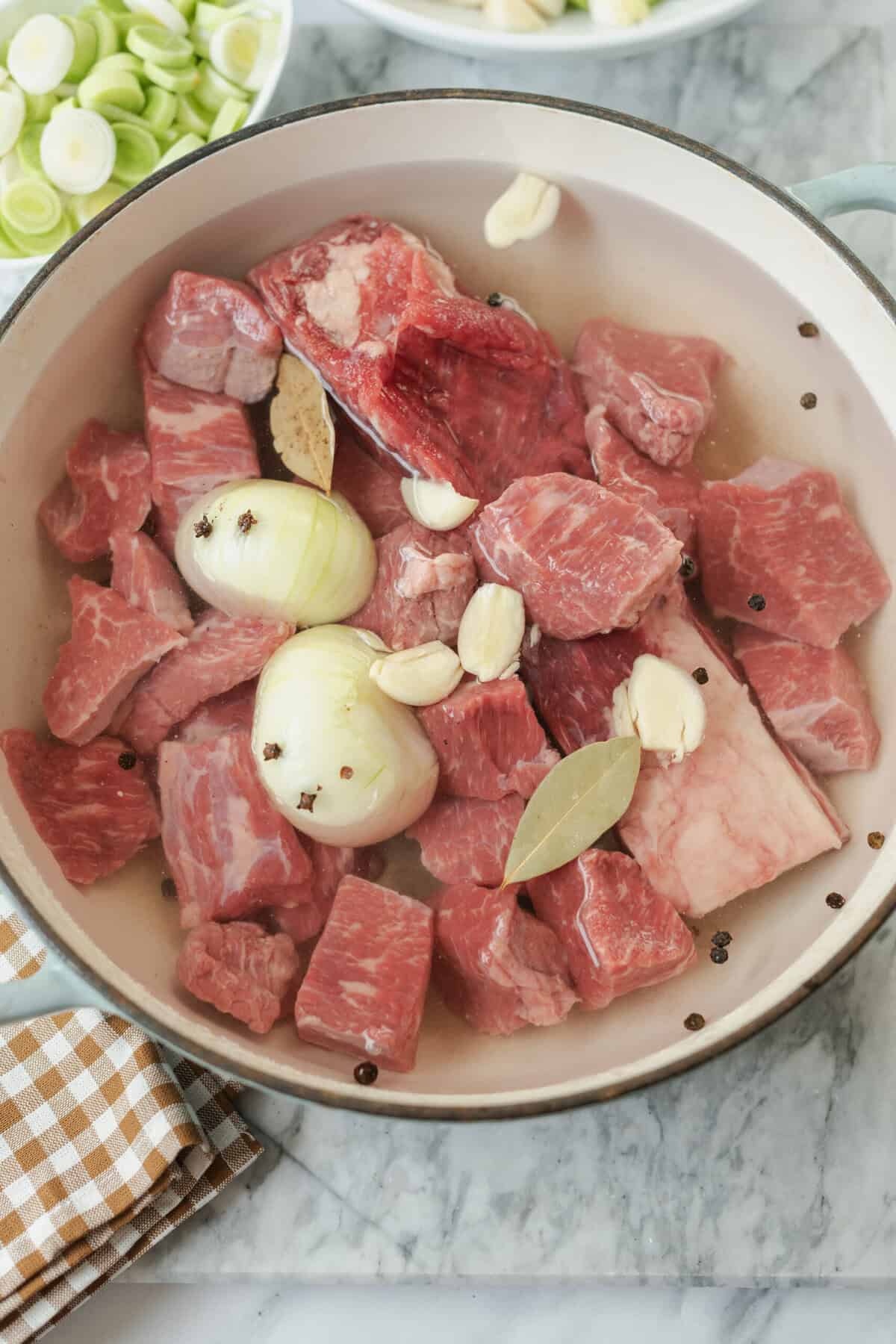 Other acceptable cuts of meat are short ribs, fatty (not lean) brisket, and oxtail. Don’t try to save time by choosing beef without bones. You need the flavoring from the marrow to make this recipe the delicious dish that it is. These tough cuts of meat feature connective tissue that breaks down as they cook, releasing collagen-rich juiciness into the beef and broth.