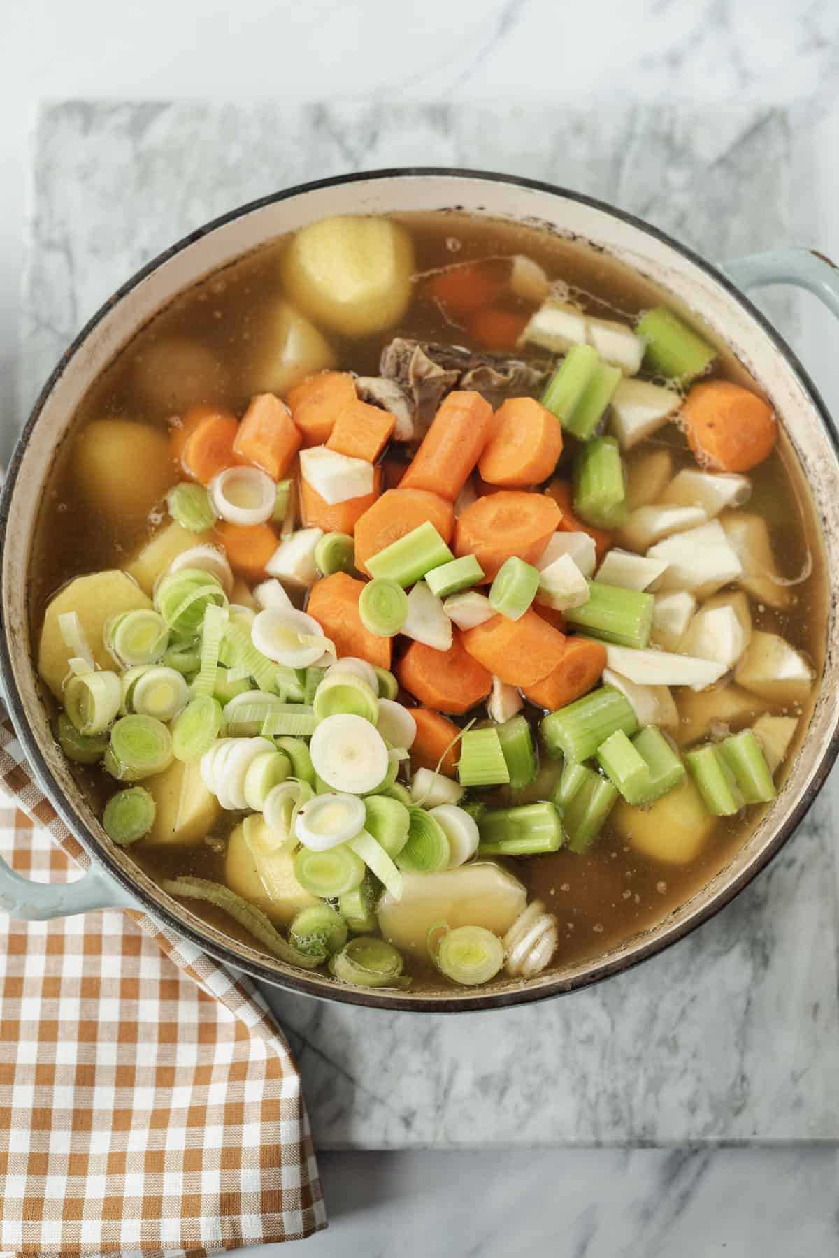 Add the potatoes, carrots, leeks, celery, turnip, and parsnip into the pot. Continue simmering for an additional 30-60 minutes, until all the vegetables are tender and the beef is fork-tender. Adjust the salt as needed before serving.