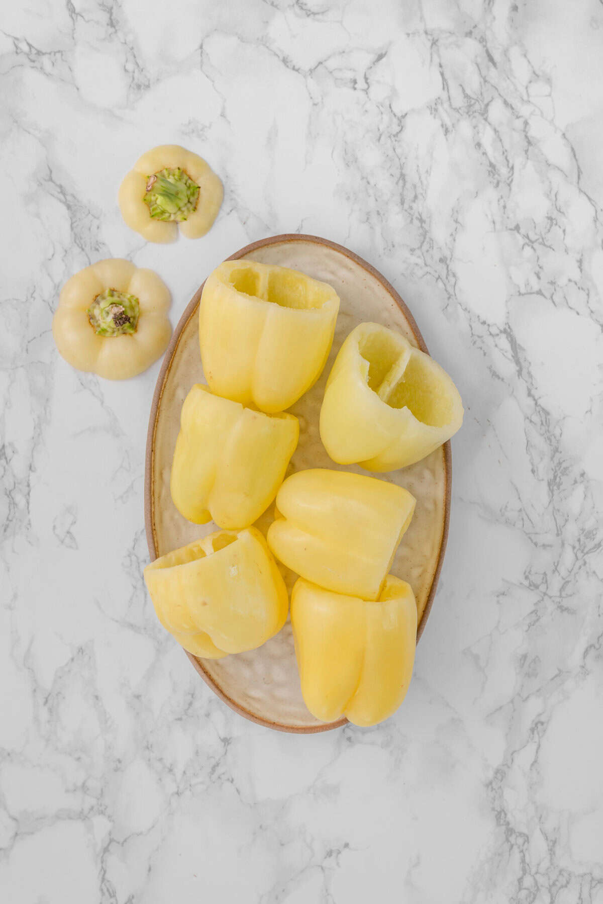 Cut the tops off the bell peppers and carefully remove the seeds and membranes to create space for the filling. Set aside.