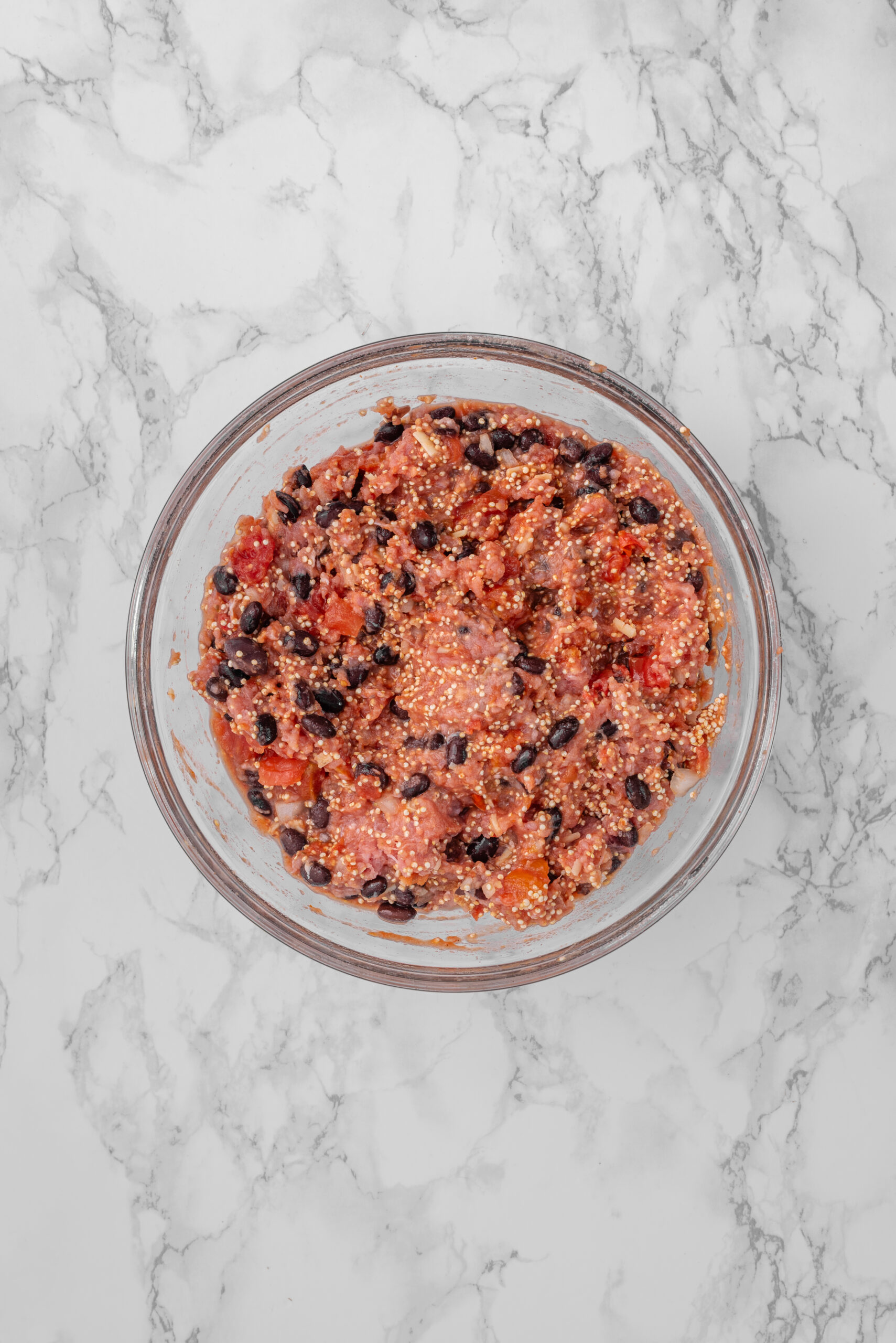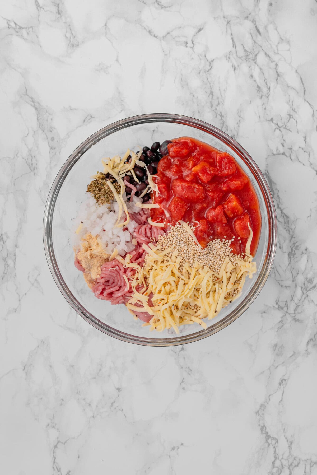 In a large bowl, mix the ground chicken (or turkey) with diced onion, black beans, fire-roasted diced tomatoes, uncooked quinoa, chili powder, dried oregano, cumin, garlic powder, salt, and 1/2 cup of the shredded cheese until evenly combined.