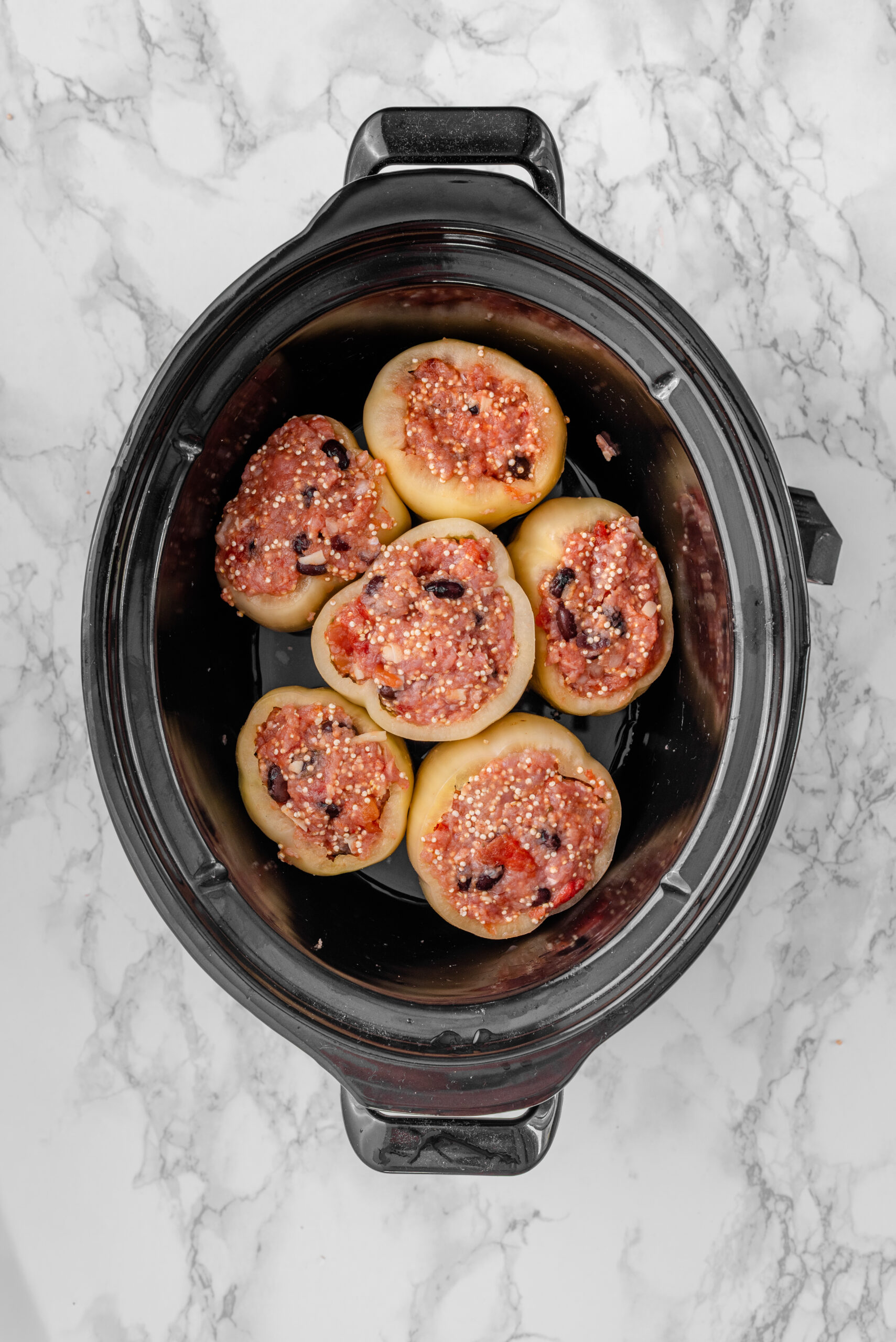 Fill each pepper with the meat and quinoa mixture, packing it tightly. Place the stuffed peppers upright in the slow cooker and add 1/2 cup water to the bottom.