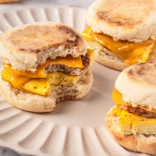 Since these breakfast sandwiches are designed to be frozen, it’s pretty easy to wrap them in plastic and stick them in the freezer, where they’ll last for up to 3 months. Then you can unwrap them and pop them in a toaster oven for a few minutes, or a microwave for 2-3 minutes with a moist paper towel underneath. If you made the sandwiches fresh and would like to simply store them for 24 hours, transfer them to an airtight container and refrigerate instead.