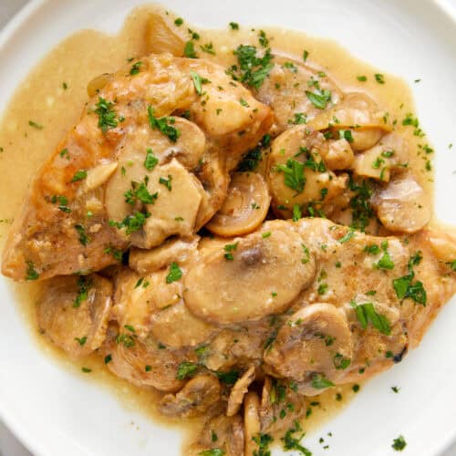 Reducing the wine, broth, and cream creates a deep, rich sauce with complex flavors, thanks to the garlic and thyme. Every succulent bite of tender, golden, pan-fried chicken and savory mushrooms can conjure thoughts of vineyards far across the sea. Speaking of mushrooms, while cremini and button mushrooms are most common for this dish, feel free to use any combination of shiitake, oyster, chanterelle, or portobello mushrooms for a deeper flavor. You can also use porcini mushrooms, but if they are dried, remember to rehydrate them in boiling water before using.