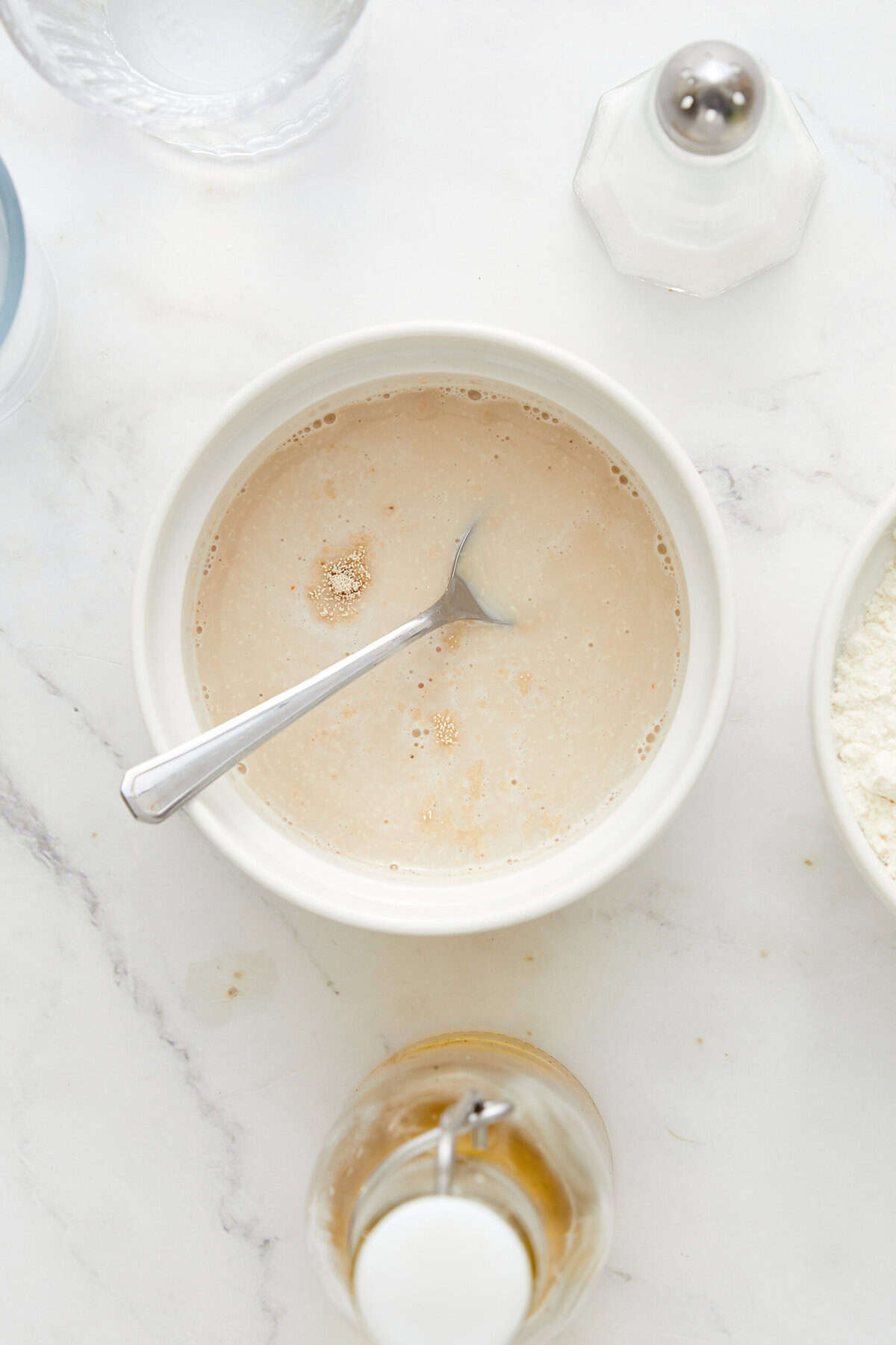 In a small bowl, dissolve the yeast and 1/2 teaspoon sugar in 1/4 cup warm water at 110°F. Let stand for about 5 minutes until frothy.