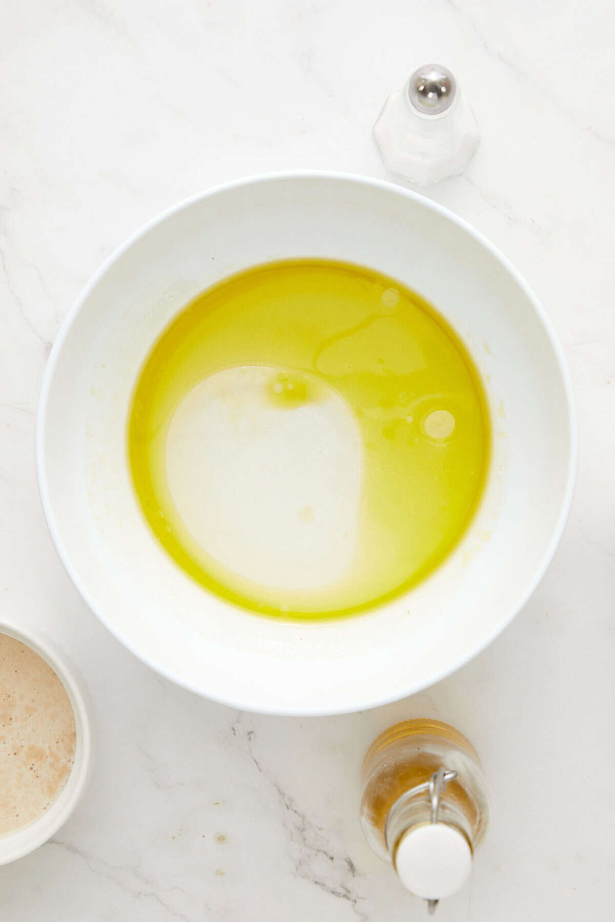 In a large bowl, combine 1 cup hot water, 2 teaspoons sugar, salt, and olive oil.