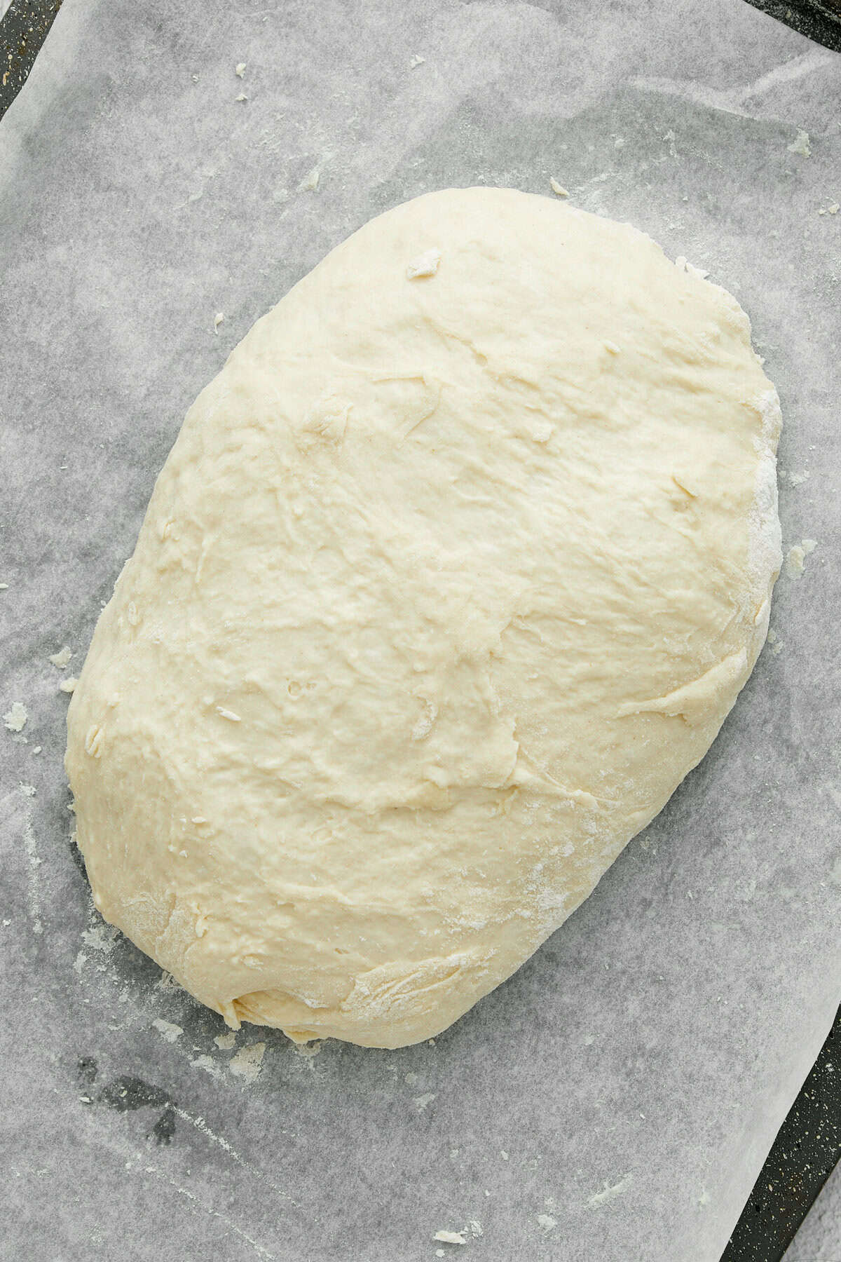 Turn the dough onto a lightly floured surface and gently shape it into a log or batard (oval) form. Transfer onto a baking sheet lined with parchment paper.