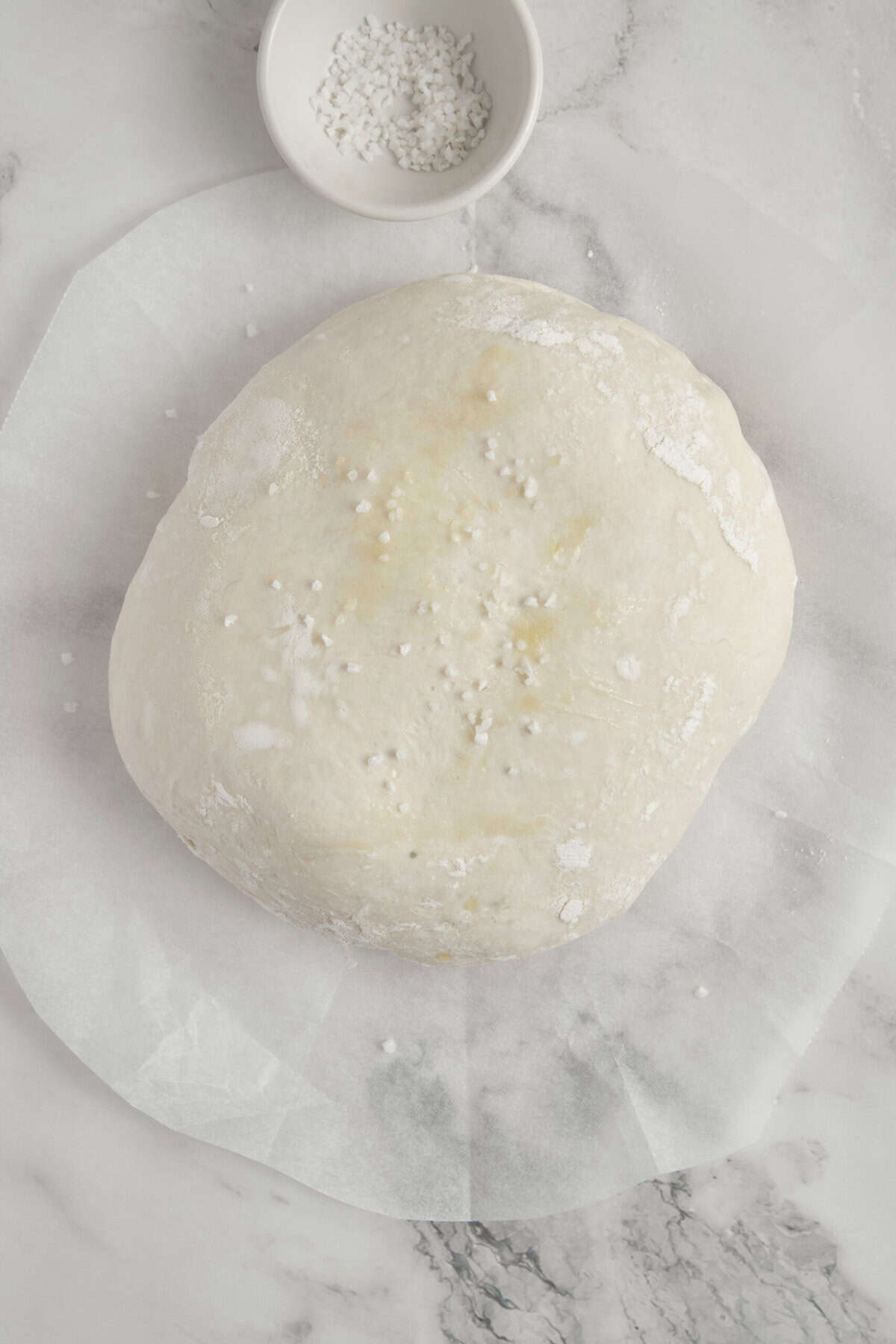Transfer the dough onto a lightly floured surface and gently shape it into a tight loaf. Preheat your oven to 450°F with a Dutch oven placed inside to heat. Brush the loaf with olive oil and sprinkle with coarse salt.