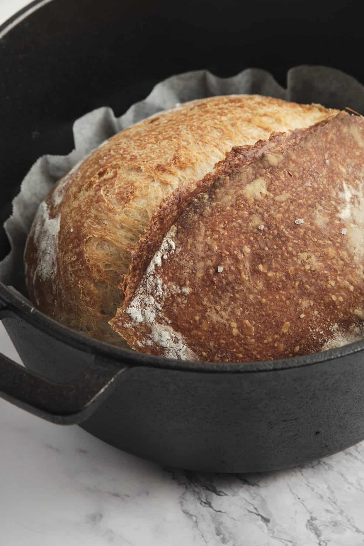 Place the dough (on parchment paper, if available) into the preheated Dutch oven, cover, and bake for 30 minutes. Then remove the cover and bake for an additional 15 minutes until golden brown. Allow the bread to cool before slicing.