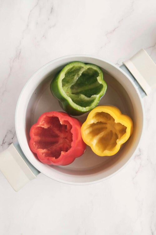 Preheat your oven to 425°F. Wash the bell peppers, cut off the tops, remove the seeds and membranes. Blanch the peppers in a pot of boiling water for 5 minutes to lightly soften them, then drain and set aside.