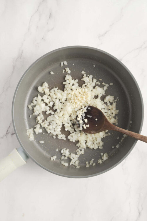 Heat olive oil in a large skillet over medium heat. Sauté the chopped onion for about 5 minutes until softened. Add the minced garlic and cook for 1 minute.