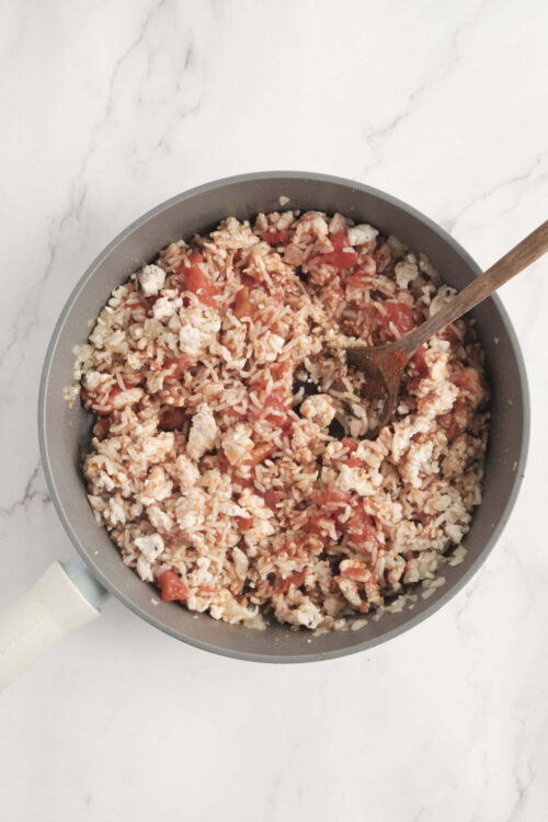 Add the ground turkey and cook until browned. Stir in the fire-roasted tomatoes, dried oregano, dried thyme, dried basil, chili powder, paprika, salt, pepper, and cooked brown rice. Let the mixture simmer for 5 minutes.
