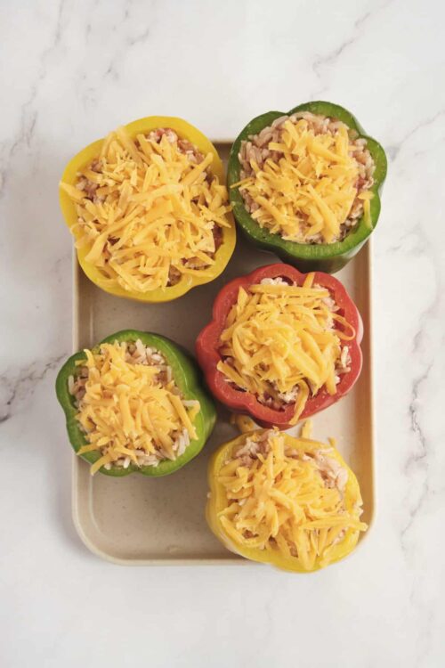 Spoon the meat and rice mixture into each pepper. Top each filled pepper with shredded cheddar cheese.