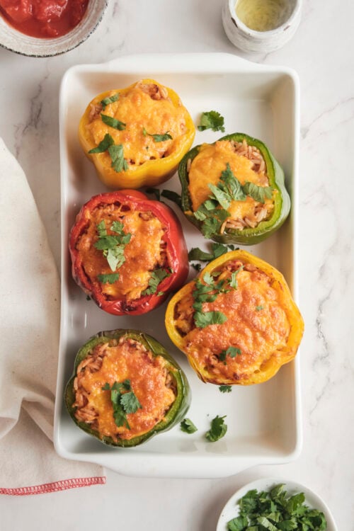Allow leftovers from this stuffed peppers recipe to cool to room temperature before refrigerating them in an airtight container for up to 4 days. Do not let the peppers sit out for longer than 2 hours. Although many recipes advise against freezing stuffed peppers because of a change in texture as they thaw, I have frozen them every time I make them. Yes, you will need to drain some liquid from the container after they thaw, but they still taste great after reheating. I recommend reheating them in a 350°F oven until warmed throughout for the best texture. Microwaving defrosted stuffed peppers tends to leave them too soggy.