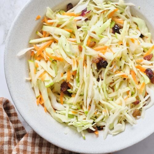 I’m excited to share a cabbage recipe with you that isn’t soup and doesn’t involve corned beef! Coleslaw has always been one of my favorite dishes to serve at barbecues, and this apple cabbage slaw is such a refreshing change of pace. You still get that satisfying crunch from the cabbage and apples, but it’s balanced with the chewy bite of cranberries and raisins. The flavor is the perfect mix of tangy—from lemon juice and vinegar—and sweet from a touch of honey. It’s like a little party for your taste buds, and trust me, you won’t want it to end.