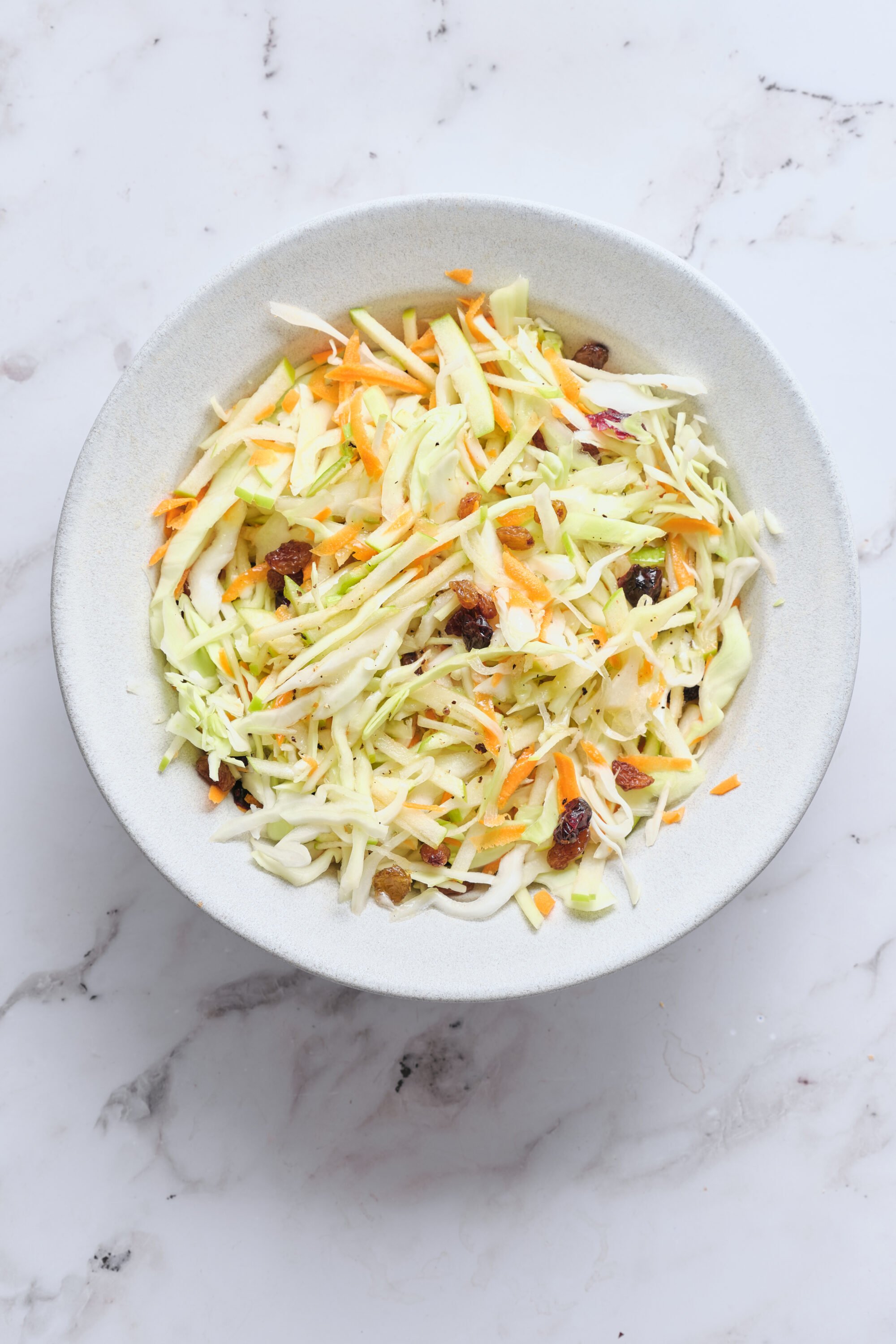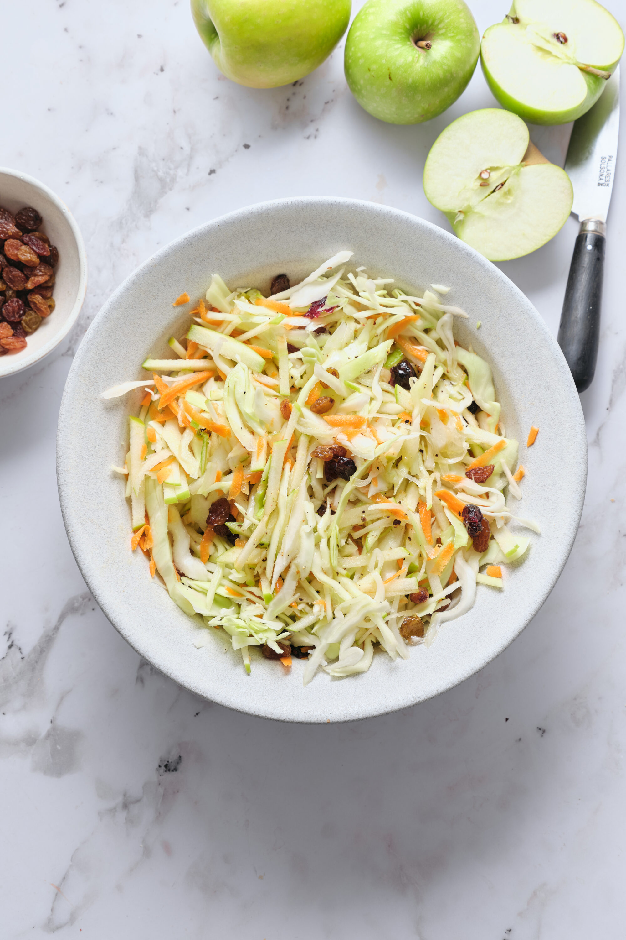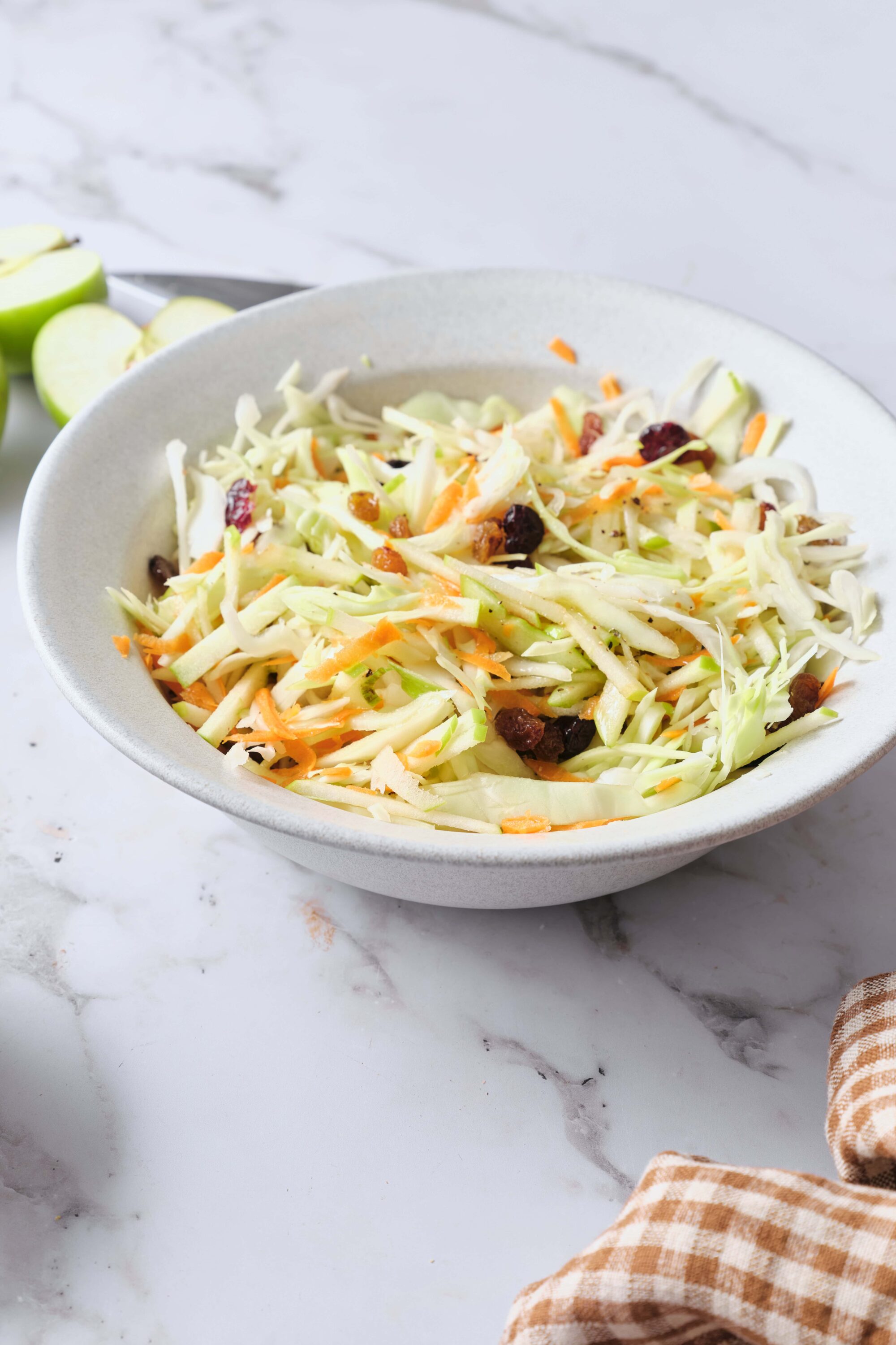 I’m a fan of adding halved green or red grapes to this slaw, either with or in place of the raisins and cranberries. You can also substitute pears for the apples and add shredded jicama and julienned red, yellow, or orange bell peppers for more flavor and color. Chopped celery is another way to add more crunch to the dish. And if you like celery seed, feel free to sprinkle some in to taste. Finely chopped scallions add a slight kick. You can also use all red cabbage or a combination of red and green cabbage in this recipe. I like variety, so I make it a bit different each time, depending on what I have on hand.