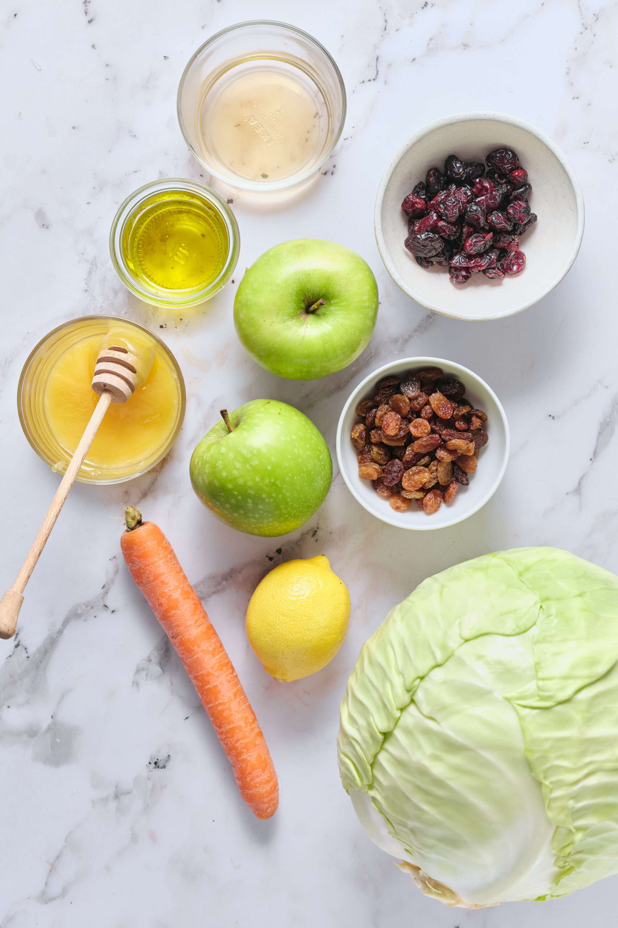 Place the cabbage, apples, and carrots in a large bowl. Mix in the dried cranberries and raisins.