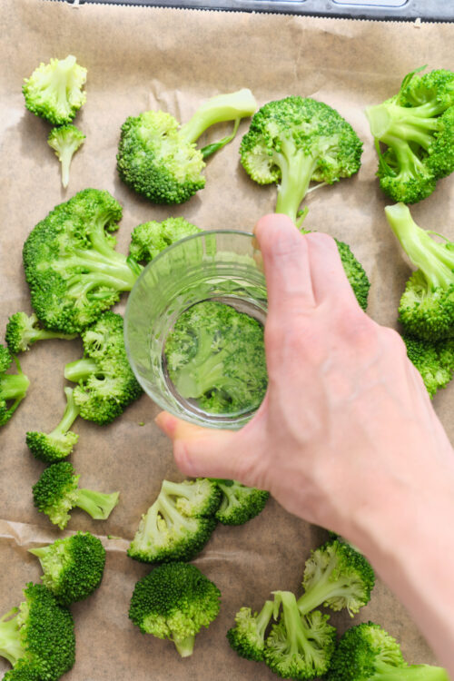 Pat the broccoli dry using paper towels. Spread the florets on a baking sheet lined with parchment paper. Using the bottom of a glass, gently press down on each floret until it flattens to about 1/2 inch thick.