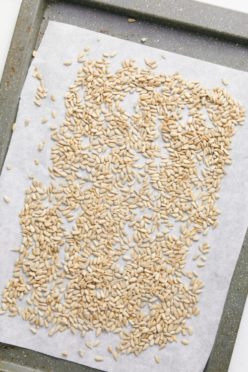 Evenly spread the sunflower seeds on a baking sheet and roast in the oven for 10 minutes. Stir the seeds halfway through to ensure even toasting.