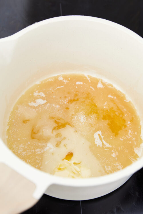 In a medium saucepan over medium heat, melt the butter with the honey and 1/2 teaspoon of the kosher salt until the mixture is bubbly.