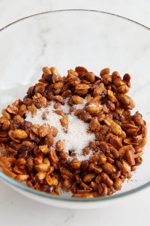 In a small bowl, mix the white sugar, remaining salt, and chili powder. After roasting, transfer the peanuts to a large bowl and toss them gradually with the sugar mixture, adding small amounts at a time. You might not need to use all of the sugar mixture.