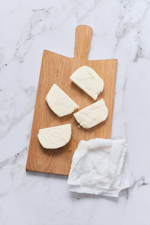 Slice the halloumi cheese into 1/2-inch thick slices and pat them dry with paper towels.