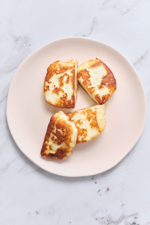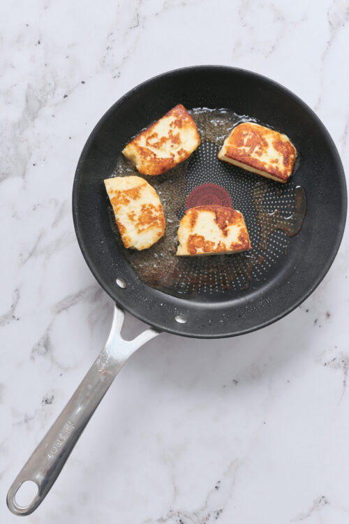 When I first discovered halloumi cheese, I was mind-blown. “How can it be this firm when cooked?” I wondered aloud. Well, the secret to its solid texture rests in how halloumi is made. Basically, this chewy cheese is crafted by pressing curds into tight blocks, then boiling them in the reserved whey, resulting in less moisture and a higher melting point. When pan-fried, each piece becomes golden brown and lightly crisp on the outside with perfectly chewy and savory insides. Although many of us are more accustomed to melty, gooey cheese, I have to say—don’t knock it ’til you try it!