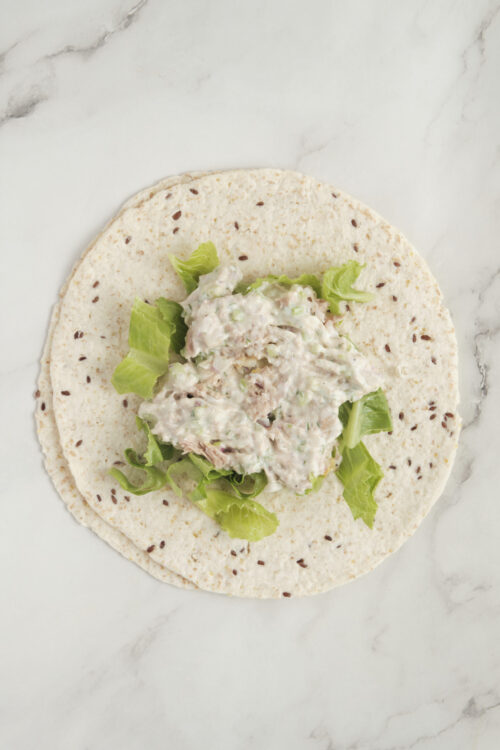 Lay out each tortilla on a flat surface. Place chopped lettuce in the center of each tortilla, then evenly distribute the tuna mixture over the lettuce.