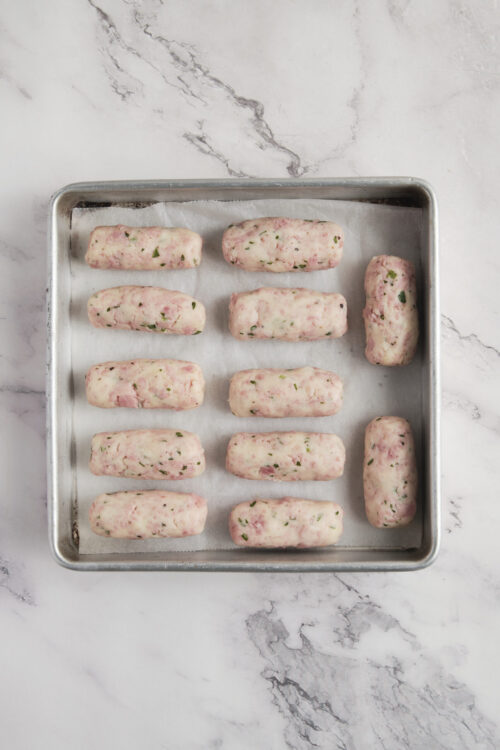 Once the filling has been chilled, shape it into small balls or logs (roughly 1 tablespoon in size).