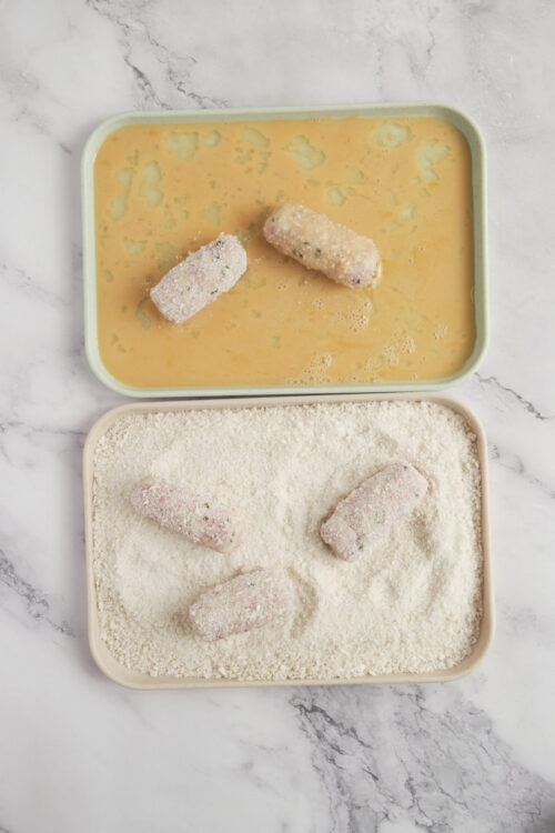 Prepare a breading station by placing the beaten eggs in one bowl and the finely crushed saltine crackers in a shallow dish. Dip each croquette first in the cracker crumbs, then in the egg wash, and finally back into the cracker crumbs for a double coating.