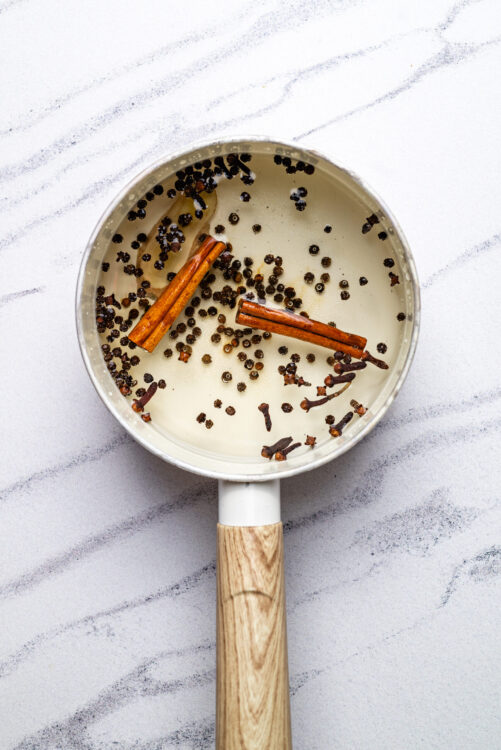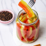 Now that you know my watermelon story, let’s talk about this amazing recipe. It’s nothing like the pickles you get in a jar, or those you make at home. These pickles have the most interesting taste as it’s a mashup of vinegary, sweet, and spicy—but not the spicy you get from hot sauce or red pepper. This is the spice you get from ginger and cloves. It almost tickles your tongue in a way you never expected.