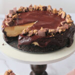 I love the rich, peanut buttery flavor you get in the smooth, creamy cheesecake filling. Then, topped with that decadent ganache, you get the perfect combination of flavors. It’s a taste combo made in culinary heaven. Of course, you can make it all the better by doing what we did in the photo and adding chopped peanut butter cups as a decoration. Or go as simple as a delicious, freshly made whipped cream. Don’t worry, I’ll give you two great recipes in the serving suggestions below.