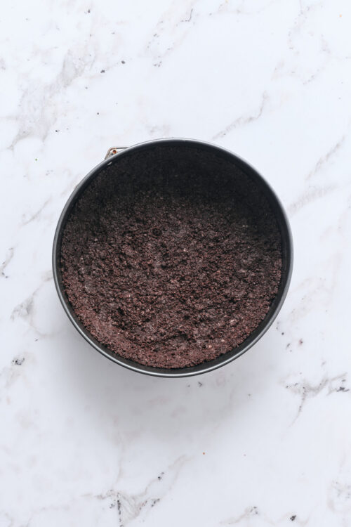 Preheat your oven to 325°F. In a food processor, pulse the chocolate sandwich cookies into fine crumbs. In a bowl, mix the crumbs with melted butter until evenly moistened. Press the mixture firmly into the bottom and partially up the sides of a 9-inch springform pan.