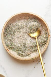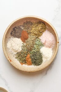 While Italian seasoning is very similar to Greek seasoning, Italian seasoning is typically a blend of herbs like oregano, basil, thyme, rosemary, and marjoram. This makes it a refreshingly herb-forward blend. Greek seasoning has plenty of herbs too, but it’s warmer and earthier because of the cinnamon and nutmeg.