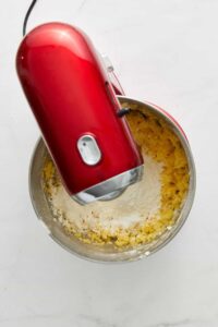 In a mixer with a paddle attachment, beat the room temperature butter, granulated sugar, and powdered sugar until smooth.