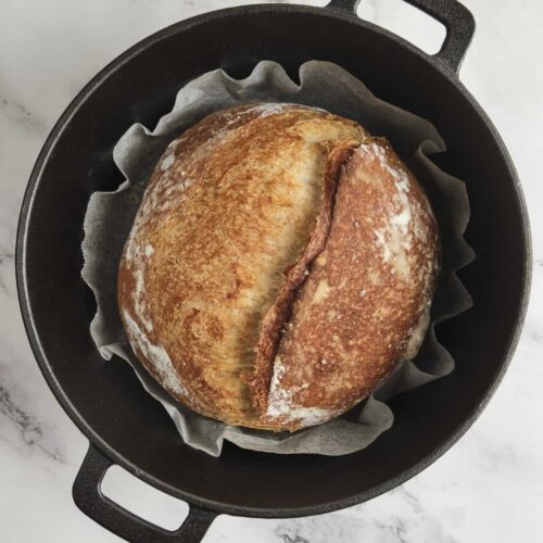 Place the dough (on parchment paper, if available) into the preheated Dutch oven, cover, and bake for 30 minutes. Then remove the cover and bake for an additional 15 minutes until golden brown. Allow the bread to cool before slicing.