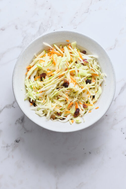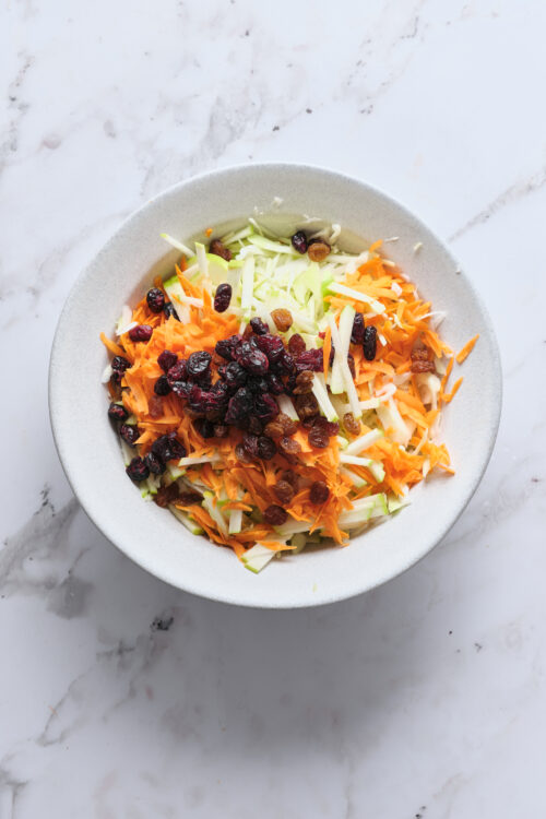 I’m a fan of adding halved green or red grapes to this slaw, either with or in place of the raisins and cranberries. You can also substitute pears for the apples and add shredded jicama and julienned red, yellow, or orange bell peppers for more flavor and color. Chopped celery is another way to add more crunch to the dish. And if you like celery seed, feel free to sprinkle some in to taste. Finely chopped scallions add a slight kick. You can also use all red cabbage or a combination of red and green cabbage in this recipe. I like variety, so I make it a bit different each time, depending on what I have on hand.